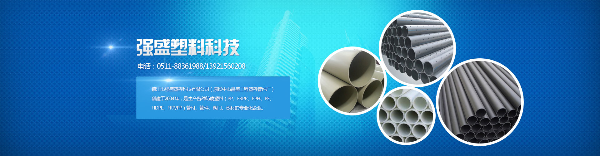 鎮(zhèn)江市強盛塑料科技有限公司(原揚中市昌盛工程塑料管件廠)創(chuàng)建于2004年,是生產各種防腐塑料(PP、FRPP、PPH、PE、HDPE、FRP/PP)管材、管件、閥門、板材的專業(yè)化企業(yè)。公司擁有各類先進生產設備,固定資產約3800萬元,可生產管材、管件口徑為Φ15-Φ1200mm,產品規(guī)格齊全。目前產品廣泛適用于醫(yī)藥、食品、冶金、造紙、電力、礦山、城市污水處理、垃圾填埋、輕工紡織等領域,暢銷全國各省市自治區(qū),遠銷二十多個國家及地區(qū)。